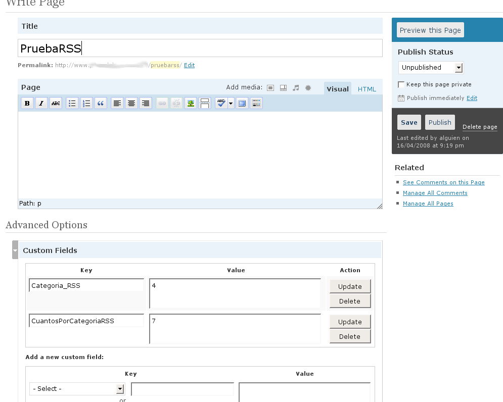 Por fin vamos a crear una página o las que hagan falta. El título el que quieras teniendo en cuenta que irá en el feed, yo lo llamé también PruebaRSS pero lo suyo sería «Feed de NOMBRE_DE_LA_CATEGORIA».Si los permalink no son los que vienen por defecto también puedes elegir el que quieras.