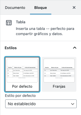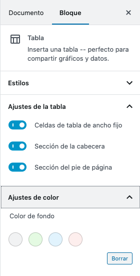 Pero antes de nada te recomiendo que te pases por los ajustes del bloque (a la derecha del editor), dónde verás que puedes cambiar el estilo de la tabla (básico o franjas, con fondo alterno).