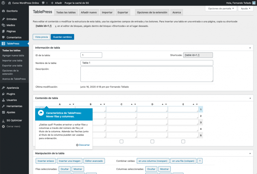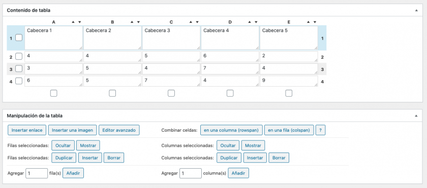 Si te fijas en la captura anterior, bajo el contenido de la tabla tienes la caja de manipulación, que es lo verdaderamente potente de TablePress.