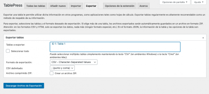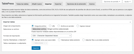Para finalizar, una opción muy interesante de TablePress es que puedes importar archivos CSV o de Excel para crear tus tablas, así como exportar tus tablas en archivos de hojas de cálculo.
