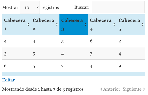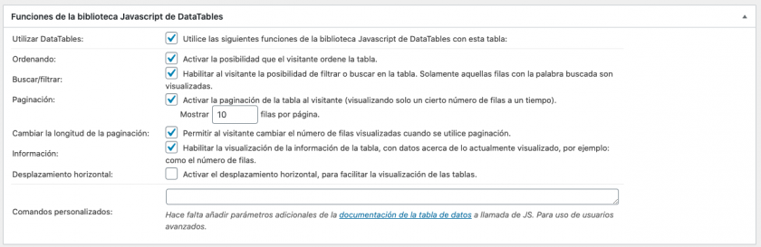 También destacan las opciones de JavaScript, más abajo, que controlan el comportamiento dinámico de tu tabla, permitiendo, por ejemplo, que los usuarios cambien el orden de la tabla, hacer filtrados y mucho más.