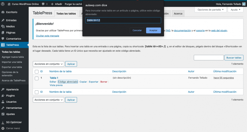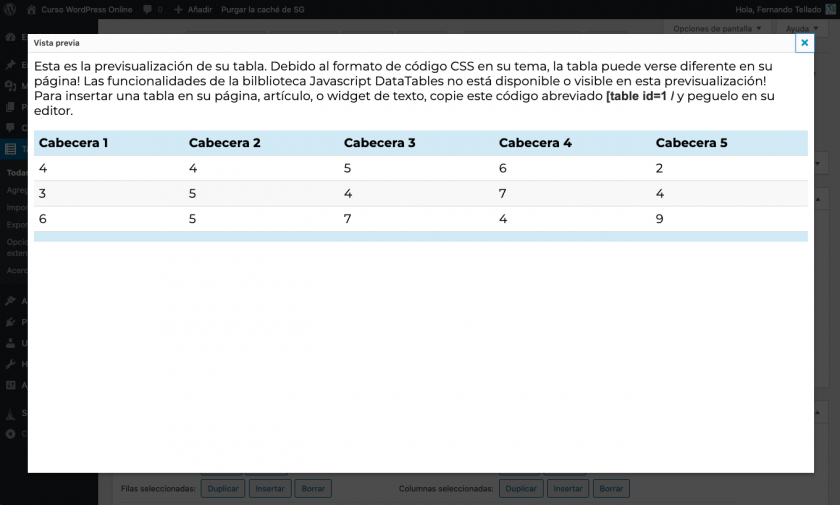 Una vez tienes terminada la tabla y configurada a tu gusto ya solo tienes que copiar el shortcode para poder utilizarla en entradas o páginas.