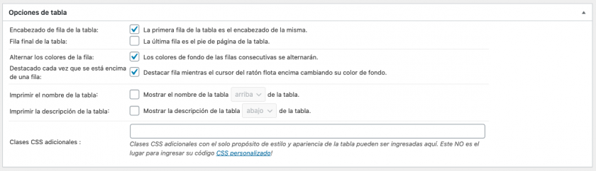 Además, TablePress, ofrece una serie de opciones de tabla.