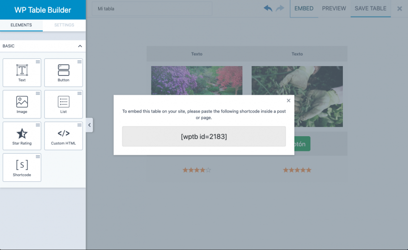 Cuando esté a tu gusto simplemente guarda la tabla y pulsa en EMBED para obtener el shortcode que podrás insertar en entradas o páginas para mostrar la tabla.