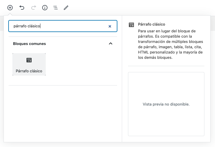 Para empezar inserta un bloque clásico o de párrafo clásico (nuevo) para ver a TinyMCE Advanced con todo su potencial.
