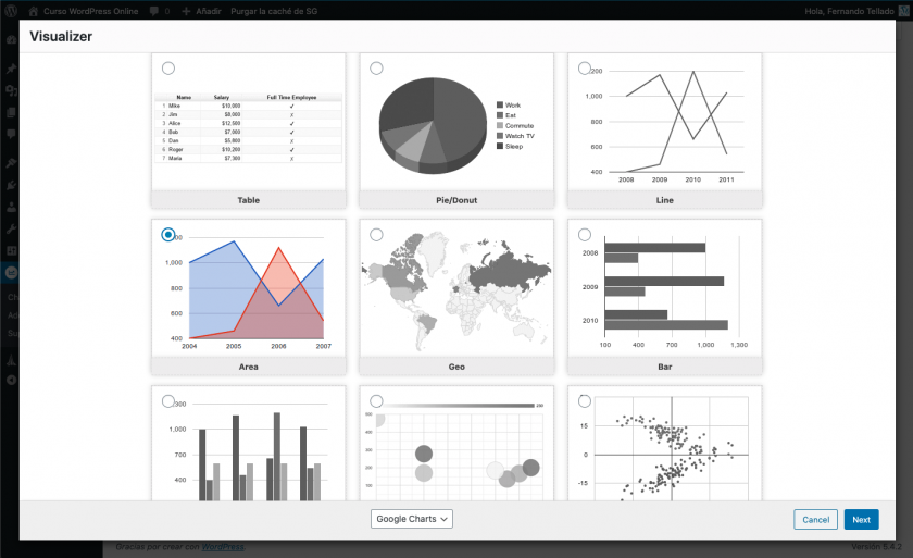 Al pulsar en el botón de añadir nuevo se abre un asistente, en el que lo primero que tienes que elegir es el tipo de tabla o gráfico, pudiendo elegir varios gratuitos.