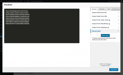 Para empezar, en la pestaña de fuentes de los datos (Source) puedes importar los datos de un archivo, una URL, o editar manualmente los datos.