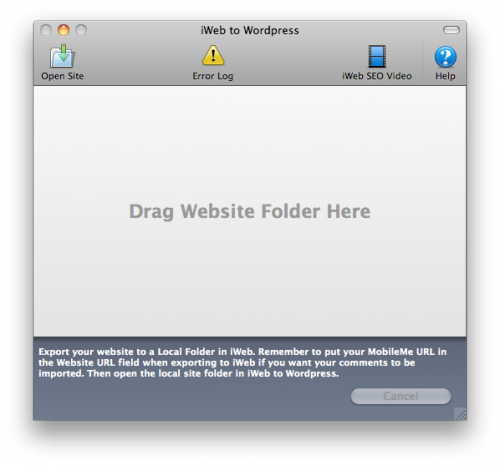 Volviendo a iWeb for WordPress, es una aplicación para Mac OSX que, tras instalarla, es coser y cantar. Abriendo la ventana principal solo tienes que hacer lo siguiente para exportar tu iWeb a WordPress: