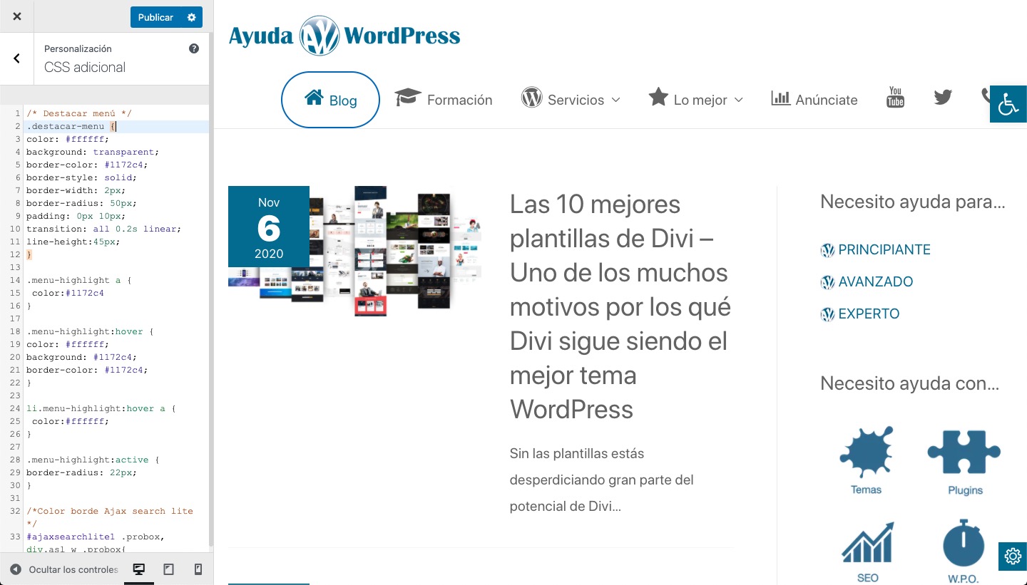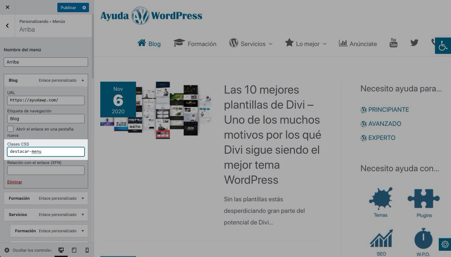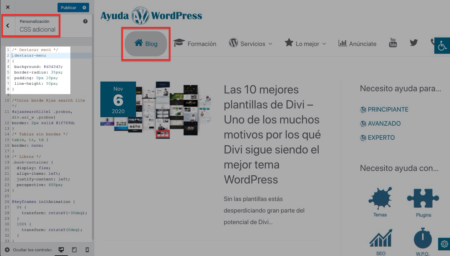 Una vez identificada le añadiremos una clase nueva, que llamaremos destacar-menu, y publicamos los cambios.