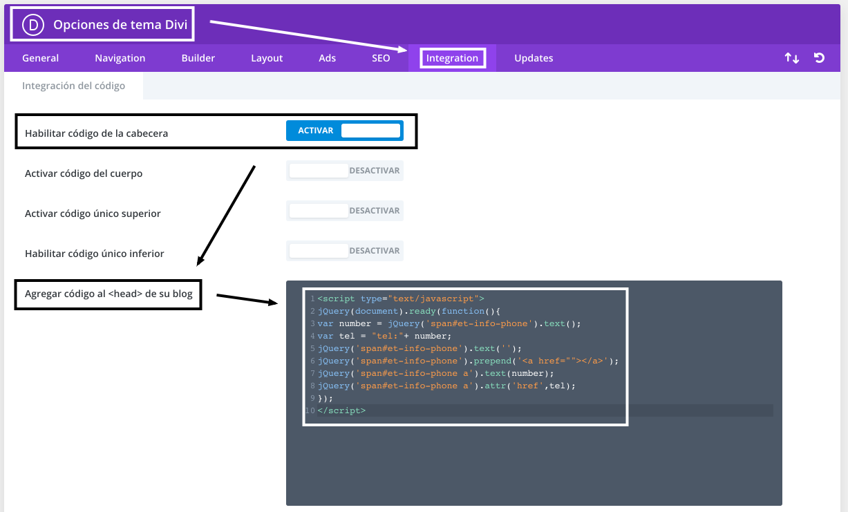 Para ello ve de nuevo al escritorio de WordPress y de ahí al menú Divi > Opciones del tema > Integration.