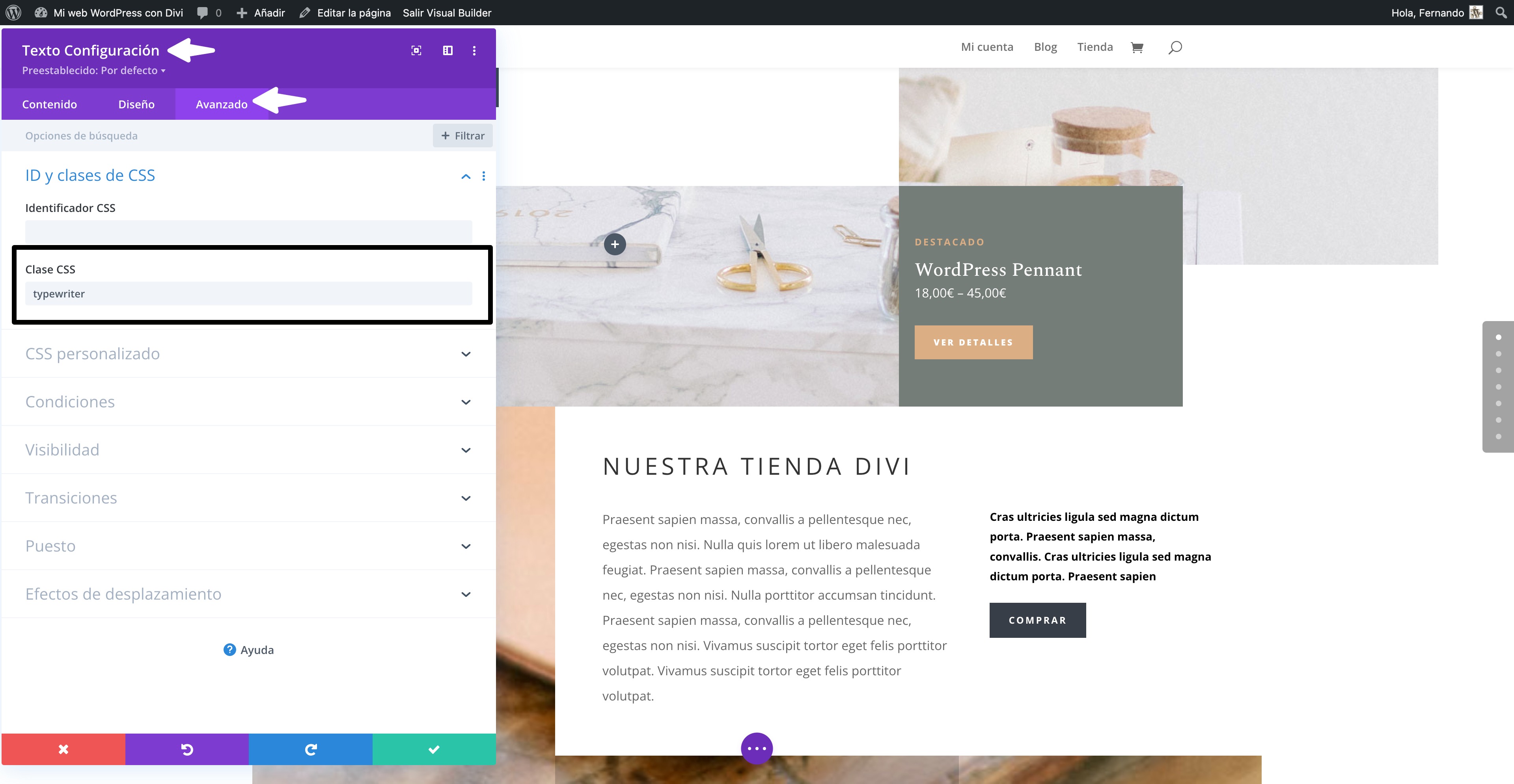 Ya que estamos hablando de Divi, sería tan sencillo como editar el módulo de texto al que quieras aplicar el efecto y, en la sección de ajustes avanzados, añadir 2 cosas: