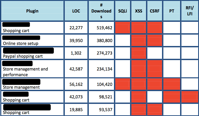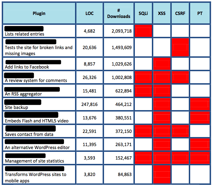 - El 20% de los plugins WordPress más populares son vulnerables a ataques web habituales. Estos plugins son vulnerables a: Inyecciones SQL (SQLi), Cross Site Scripting (XSS), Cross Site Request Forgery (CSRF) y Path Traversal (PT).