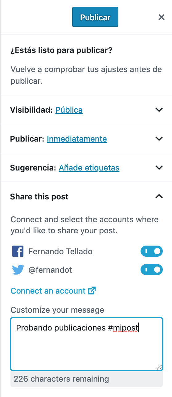 Además, que se integra de maravilla con el editor de bloques, añadiendo unas cajas en la barra lateral pre-publicación, para que puedas personalizar tu publicación en redes.