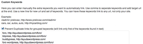 Hay un plugin maravilloso, que te reconozco uso en la mayoría de los WordPress que tengo. Se llama SEO Auto Linker y, además de facilitar los autoenlaces a contenido propio, de manera automática, cosa que nunca recomiendo, tiene una sección especial en la página de ajustes, llamada «custom keywords» donde puedes hacer que cada vez que en el texto de tus entradas aparezca una palabra o frase concreta esta se autoenlace a la URL que tu le digas.