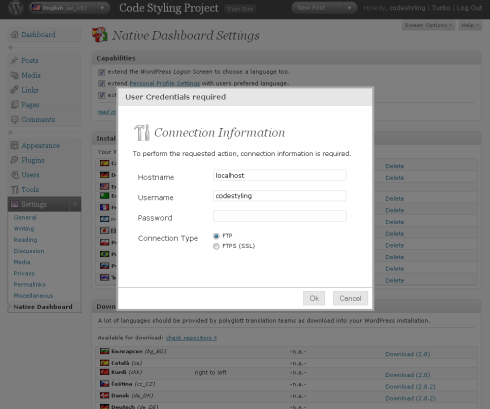 Si quieres instalar algún idioma más, lo primero que te pide son los datos de acceso por FTP: