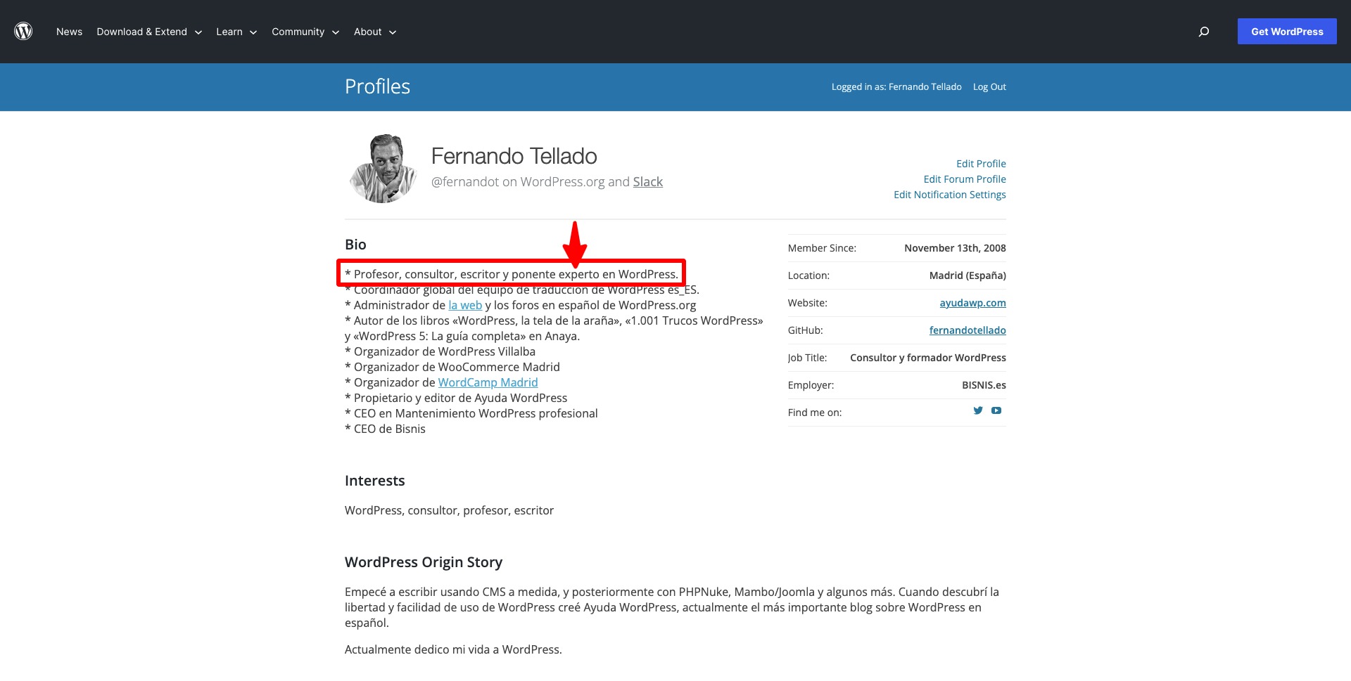 «Te estás flipando, Fernando, tú mismo pones en tu perfil que eres experto en WordPress» (adjunto captura)