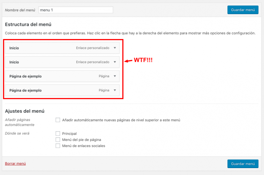 Eso sí, lo que no te salva es del fallo de WordPress de duplicarte los elementos de menú si ya tenías un menú creado con el mismo nombre, que lo sepas.