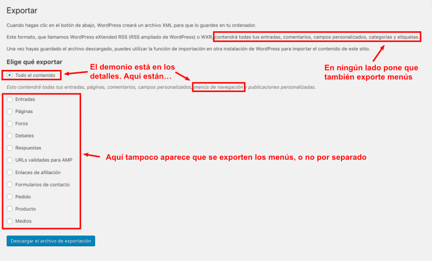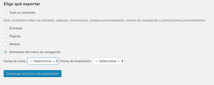 Así que sí, WordPress permite exportar los menús de navegación, pero conjuntamente con el resto de contenidos.