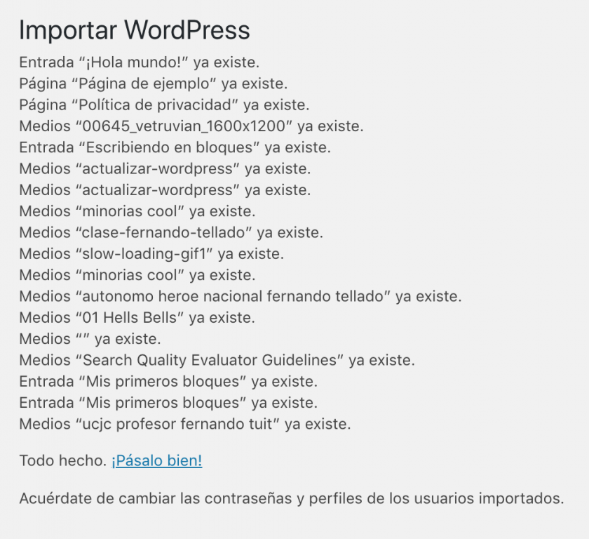 De la manera que hemos visto antes, la nativa de WordPress, tienes que hacer una exportación completa, con lo que supone de pérdida de tiempo y confirmaciones de errores de que tal o cual contenido ya existe y demás.
