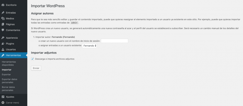 Luego, el proceso de importación es exactamente igual que con cualquier otro archivo XML exportado de WordPress, con la salvedad de que ahora solo importará los menús.