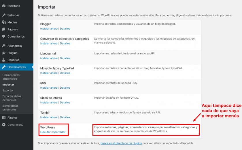 Como se puede ver en la captura, el importador de WordPress es muy explícito en su descripción pero no dice nada de menús, así que la duda es más que razonable.