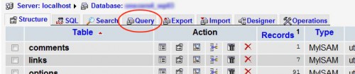 Una vez en PHPmyAdmin elige la base de datos de tu WordPress y, en la ventana principal, selecciona la pestaña llamada «Query» (o Buscar):