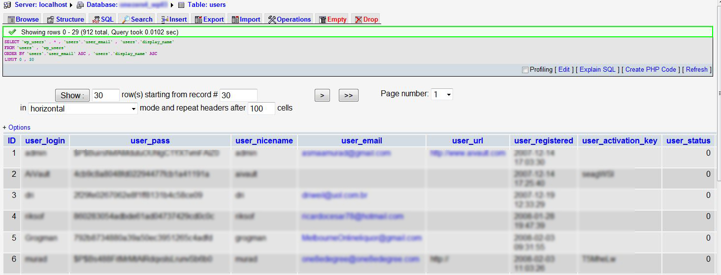 De la lista de tablas elige la llamada «wp_users» (si cambiaste el prefijo sería otro, claro):
