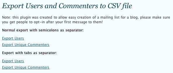 Además es megasencillo de usar, lo instalas, lo activas y, en la página del plugin, tienes los enlaces para exportar tus usuarios o comentaristas a CSV.