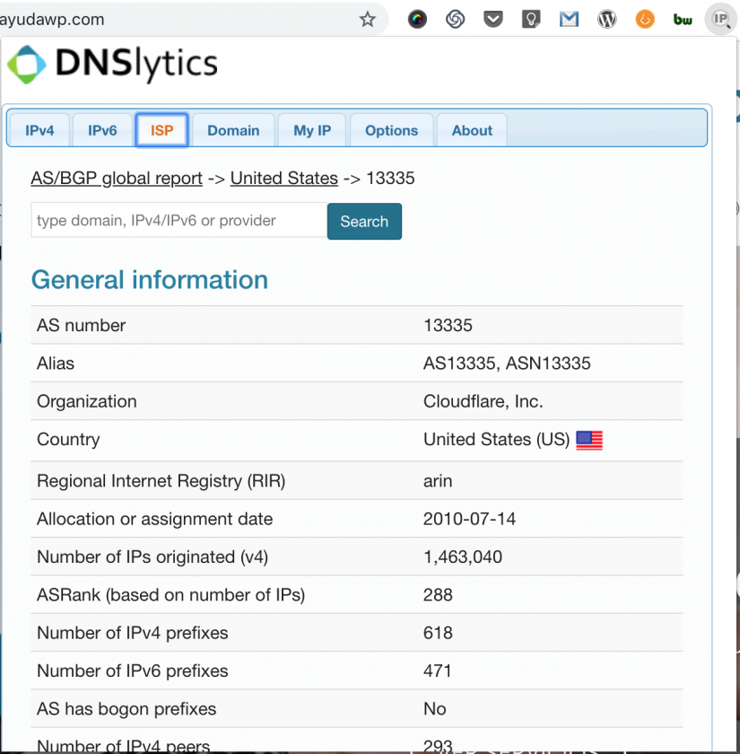 Además de mostrarte tu propia IP, algo siempre útil, su función principal es mostrarte los datos del dominio y el hosting de la web que estés visitando desde el navegador.