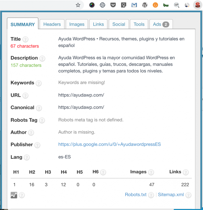 Empezando con la sección SEO de extensiones para Chrome, me gusta tener siempre esta, pues te muestra de un vistazo las metas de la web que visitas, cabeceras, información de enlaces, imágenes, un poco de todo.