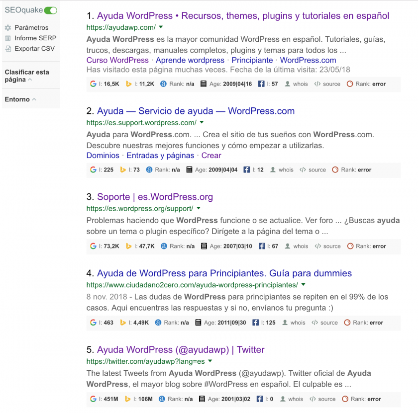 Esto ya es otra cosa. Alimentada por el conocido servicio, ofrece amplia información de rankings y, aunque a primera vista no te informa del SEO de la web, también añade una funcionalidad de valoración y posicionamiento a los resultados del buscador.