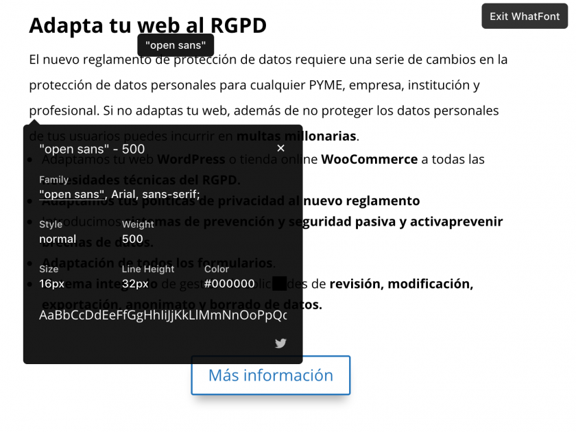 Otra joya para diseñadores web es esta extensión que se va chivando de qué fuente usa el elemento sobre el que pasas con el cursor una vez la activas.