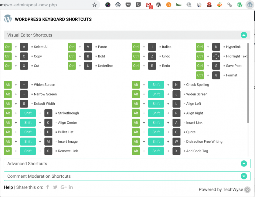 Aún no está actualizado para los atajos de teclado del editor de bloques Gutenberg, pero seguro que pronto la actualizan.