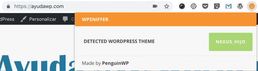 También muy sencilla, esta extensión te muestra, al hacer clic en su icono, el nombre del tema que está utilizando una web WordPress.