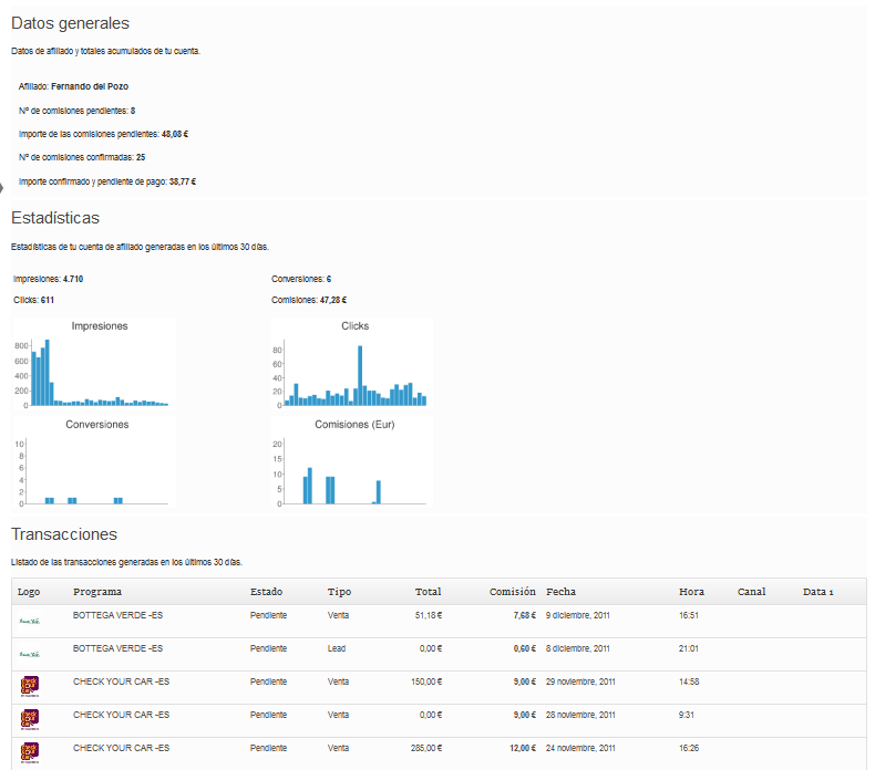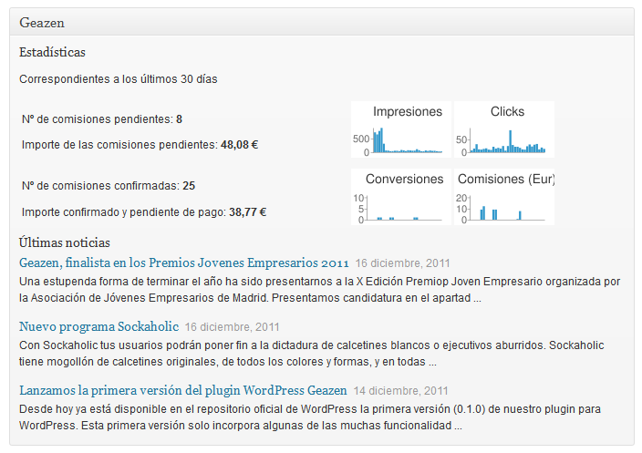 No contentos con ello hoy mismo han incorporado una versión nueva que me parece un importante avance, en la buena dirección, y es la inclusión de las estadísticas de afiliado en el mismo plugin, para que no tengas que salir de WordPress a comprobar como van tus ganancias, evitando así que tengas que acceder a la web de la plataforma. Todo desde WordPress, lo cual es genial, es hacer bien las cosas.