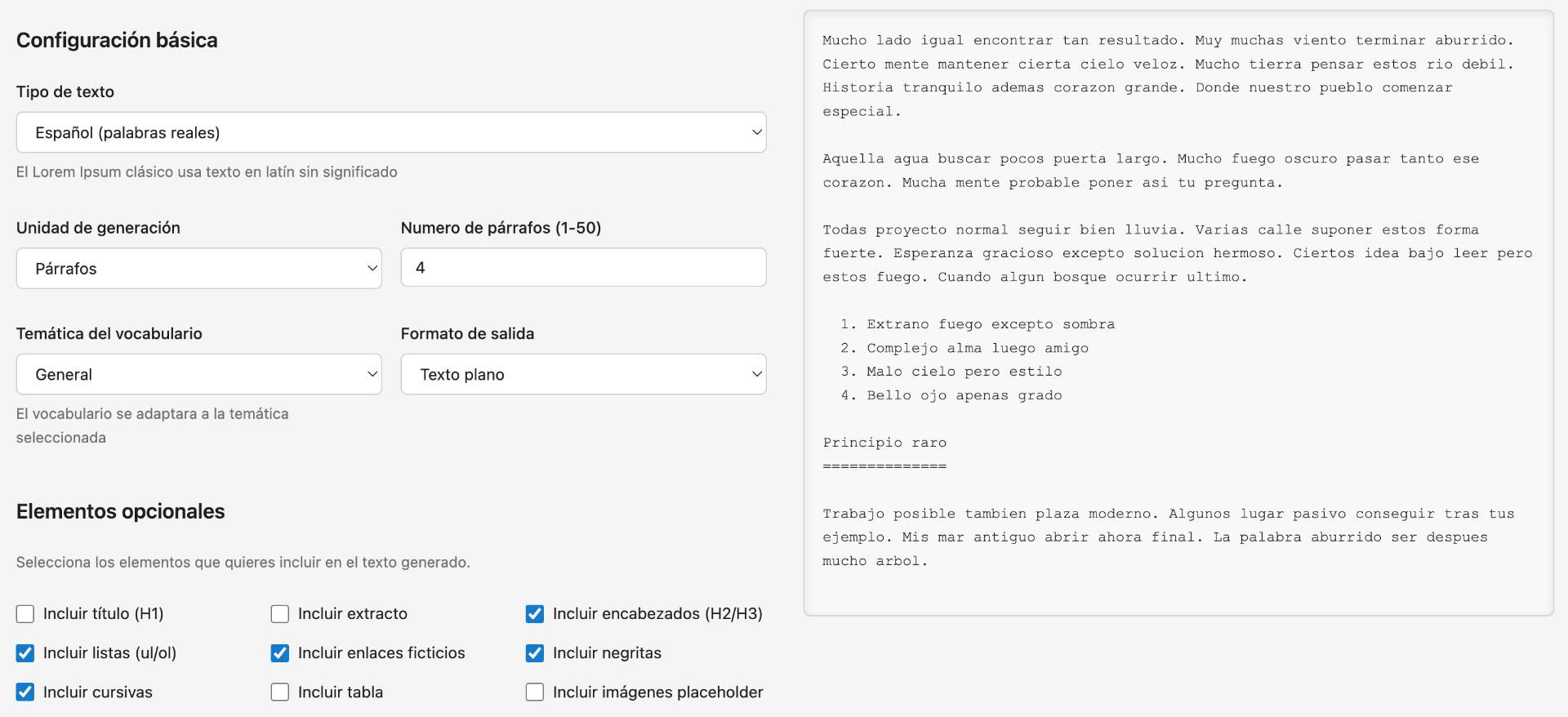 Por eso he creado un generador de textos de prueba en español que va mucho más allá del clásico Lorem Ipsum latín sin sentido. Es una herramienta completamente gratuita, sin necesidad de registro, y pensada específicamente para quienes trabajamos con WordPress.