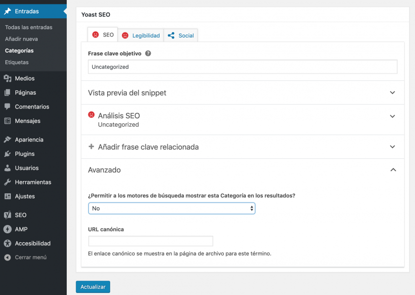 Pues igual que con los contenidos, y es que mucha gente ni siquiera sabe que la caja meta de Yoast SEO también está disponible por defecto en las taxonomías.