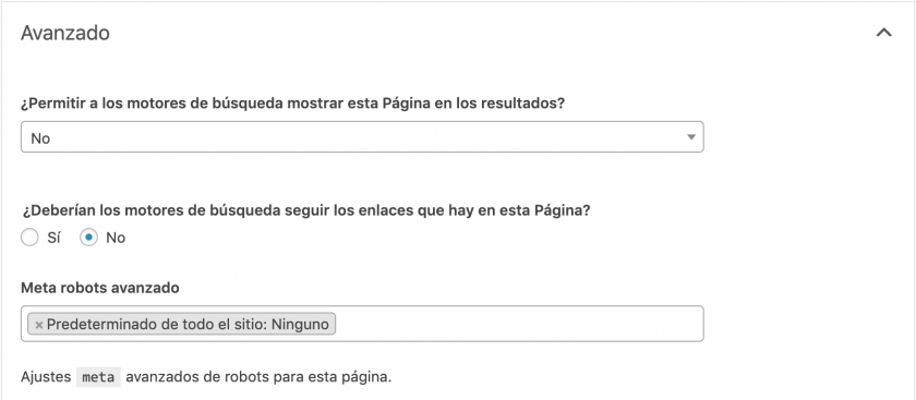 Si, además, quieres que los bots de los buscadores no sigan los enlaces que haya esta página, cambia la siguiente casilla denominada «¿Deberían los motores de búsqueda seguir los enlaces que hay en esta Página?» a «No».