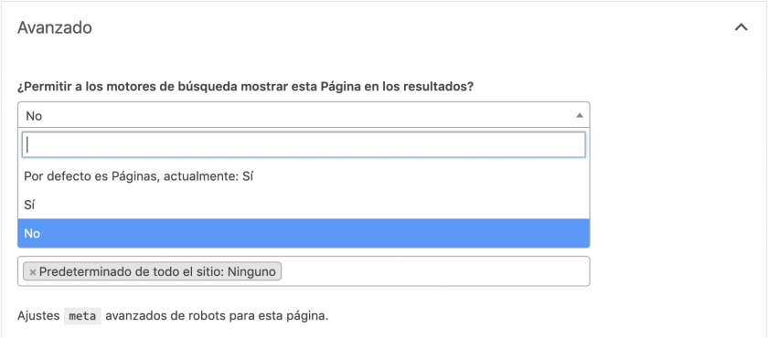 Al cambiar este ajuste a «No», además de no aparecer en la lista de URLs del sub-mapa del sitio de páginas (page-sitemap), añadirá a la cabecera HTML de esta página la meta noindex.