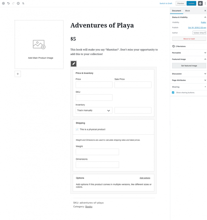 Pero en un futuro cercano, seguramente este mismo año, dentro de la fase 2 de Gutenberg, está ya previsto que WooCommerce convierta el actual editor de productos a bloques, como en el siguiente boceto: