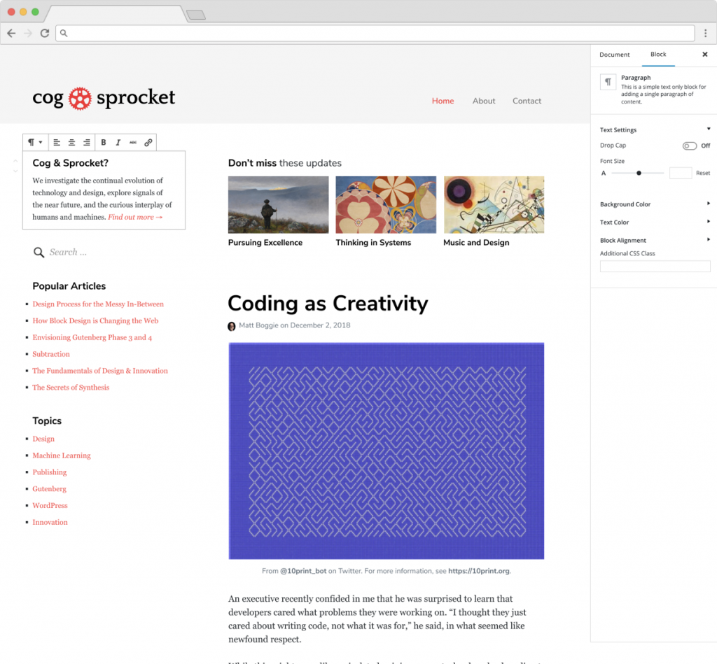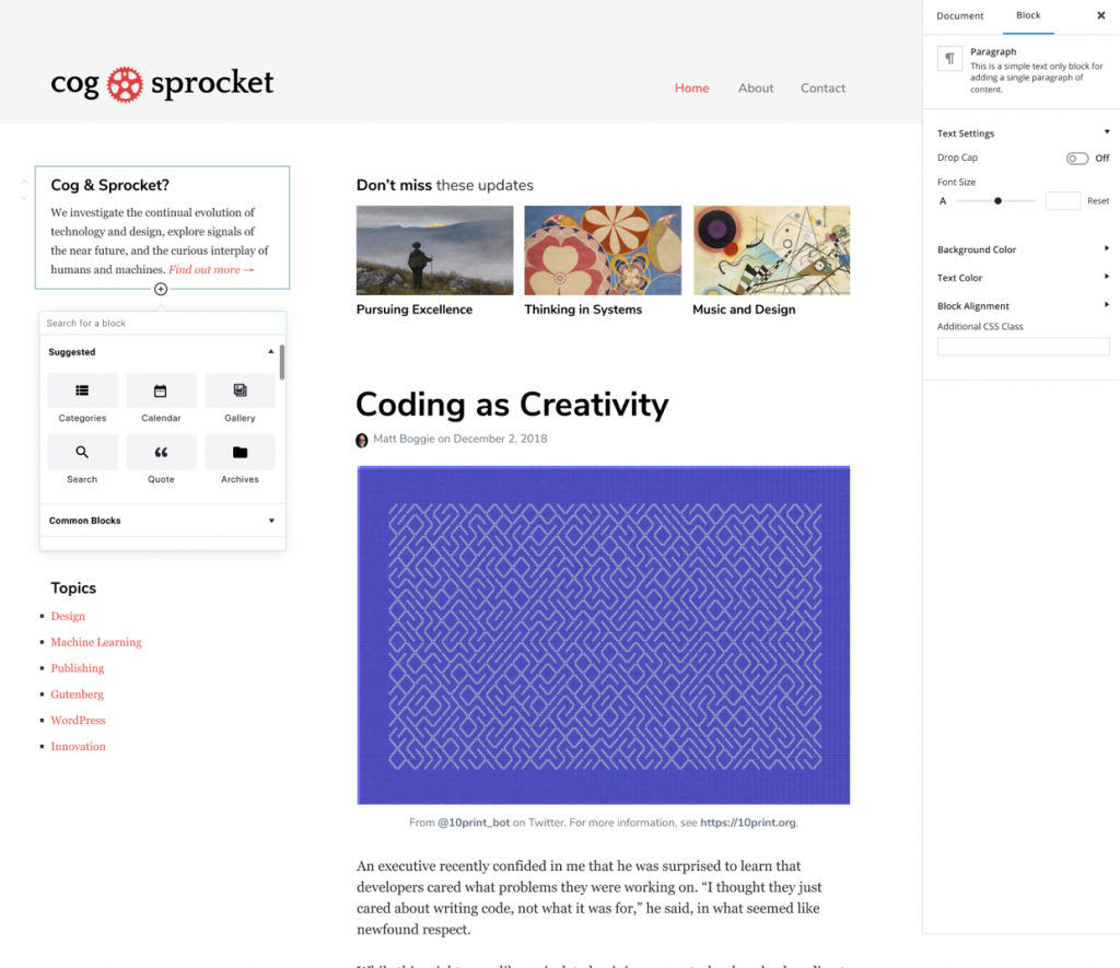 Programada para 2019, aún sin mes definido, en WordPress 5.1 comenzará la fase 2 de Gutenberg, que nos llevará a un WordPress con cada vez más JavaScript (React) y, sobre todo, bloques, bloques por todas partes.