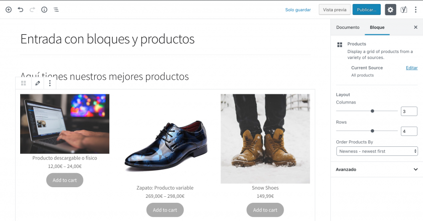 De hecho ahora mismo, desde la versión 3.5.1, ya puedes instalar el plugin WooCommerce Blocks, que permite insertar productos en entradas y páginas.