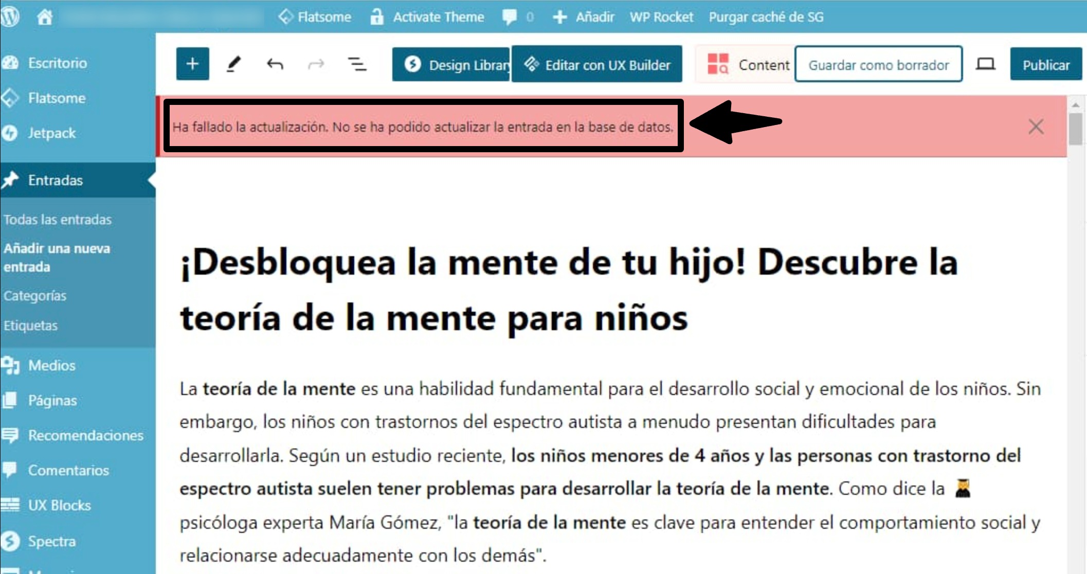 No sé realmente desde cuándo ocurre este error porque surge de vez en cuando, y últimamente con demasiada frecuencia. Me refiero a que al tratar de publicar o actualizar una entrada desde el editor de WordPress no hay manera, simplemente muestra un error de que no se ha podido actualizar en la base de datos.