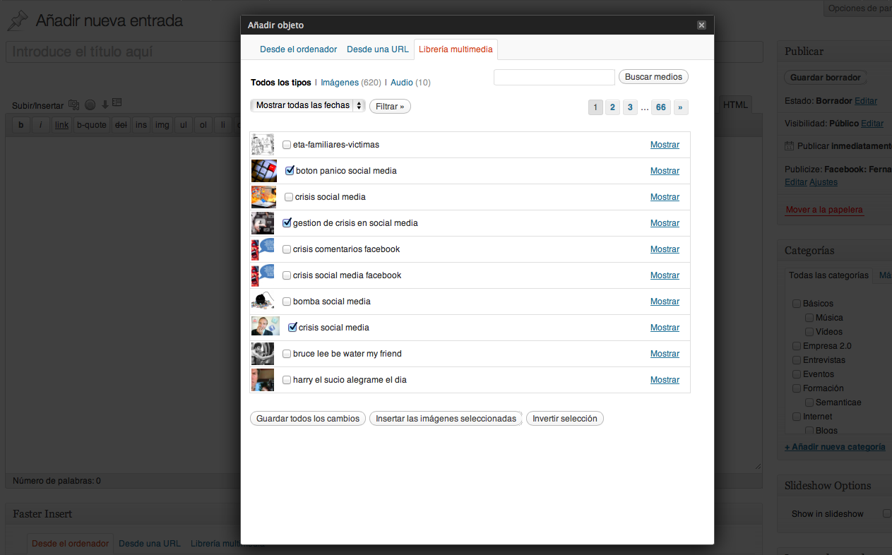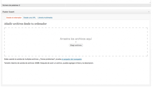 Ah, y también se integra en el cargador emergente «normal«, al que añade un par de pequeñas pero imprescindibles funcionalidades: una casilla de selección junto a cada imagen y el – ahora – necesario botón llamado (alegremente) «Insertar las imágenes seleccionadas«.