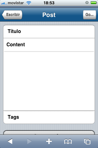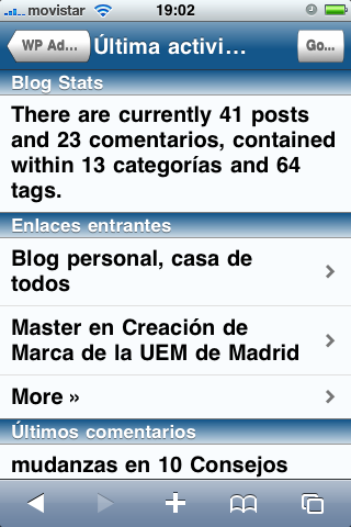 Aquí tienes unas capturas de la versión traducida que utilizo en varios de los blogs en los que escribo. Mañana veremos mas posibilidades para bloguear en el iPhone, y verás como solucionamos algunos de los problemas vistos hasta ahora.