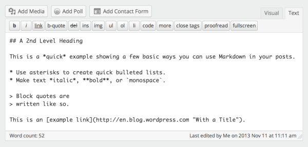 Pero quizás lo más llamativo es la adopción del sistema de formato de textos mediante marcado, o Markdown, un sistema heredado de los antiguos sistemas utilizados en foros años atrás o en Tumblr, que permite al escritor aplicar formatos sin usar los iconos visuales pero sin tener tampoco que recurrir al HTML.