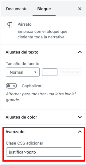 Ahora, cuando quieras que un bloque justifique el texto solo tienes que añadir la clase recién creada (justificar-texto) en la caja del editor «Avanzado > Clase CSS adicional», como en la siguiente captura: