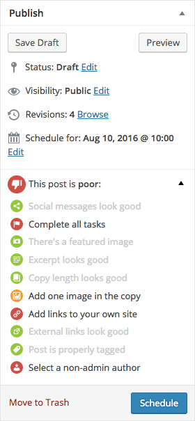 Para que te hagas una idea, se podría decir que es una mezcla de las herramientas editoriales de Edit Flow, el analizador de contenido de Yoast SEO y el módulo Divulgar de JetPack, con algunos extras más.