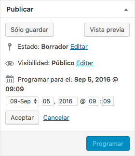 Una vez elegida la fecha y hora simplemente acepta y el botón Publicar pasará a denominarse Programar, uno de los estados de publicación de WordPress. Una vez guardes/programes, tu publicación quedará a la espera de la fecha y hora elegida para publicarse automáticamente.