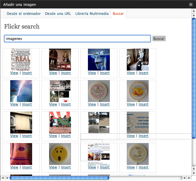 Solo tienes que descargarlo e instalarlo y desde ese momento, en el cargador de objetos verás una nueva opción de «Buscar», y dependiendo si lanzaste el cargador de imágenes o vídeo, te busca también en Flickr o YouTube, ¡Genial!. Puedes previsualizar los archivos pero es especialmente llamativa la búsqueda de vídeos, pudiendo ver el vídeo antes de insertarlo.